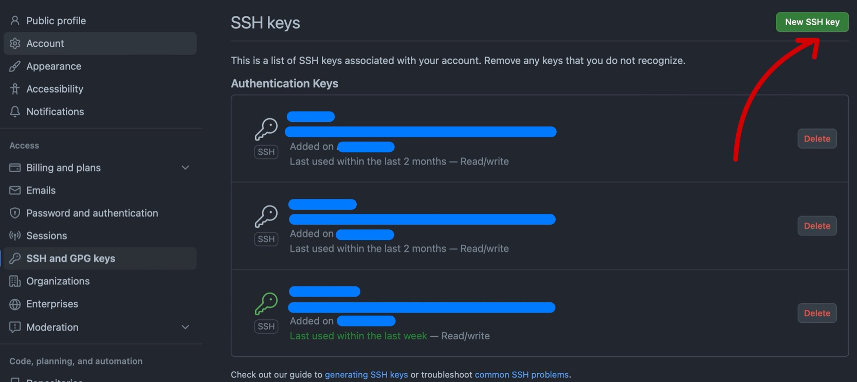 SSH and GPG keysClick on theNew SSH key.